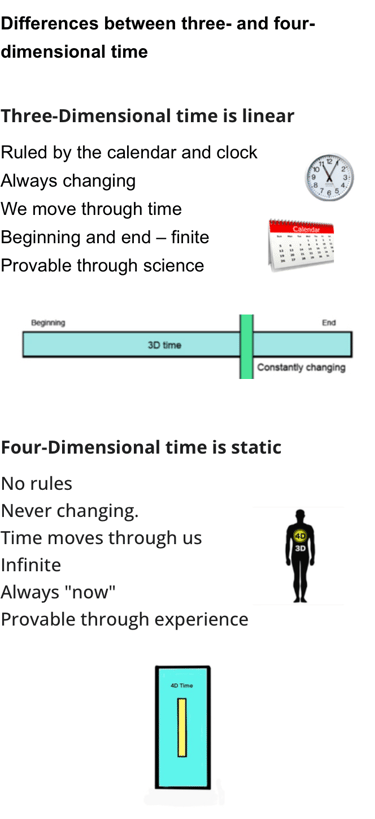 Simply put, four-dimensionality represents Consciousness in action. As the 3D/4D spectrum chart in the previous chapter indicates, Consciousness by itself is without form in this dimension and Ego without Consciousness is lack of humanity. We strive for balance, true and simple. Our unification with Oneness is the intersection where three and four-dimensionality intersect in perfect harmony. For synchronicity to occur, we must recognize the relationship between three- and four-dimensional time. Both are essential, both are important, and when in sync, a pleasant way to live our lives.